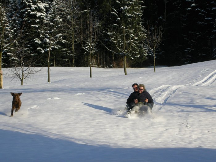Bei unserem Haus können Sie sich im Schnee austoben und es stehen gratis Schlitten zur Verfügung.